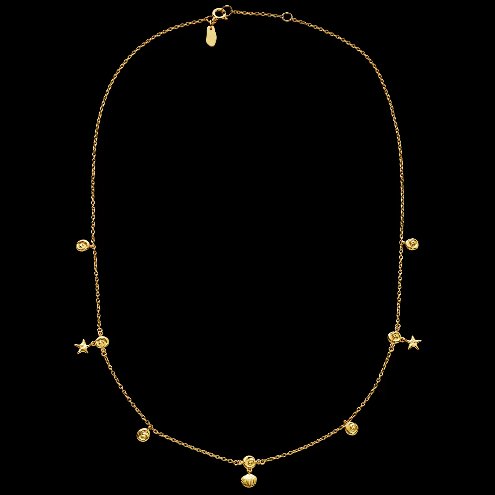 Leilani halskæden er en hyldest til den hawaiianske skik, hvor halsen smykkes med kranse af blomster. Her er det havets fauna — muslingeskaller og søstjerner — der pryder halsen, mens glimtende zirkoner giver et himmelsk touch.
