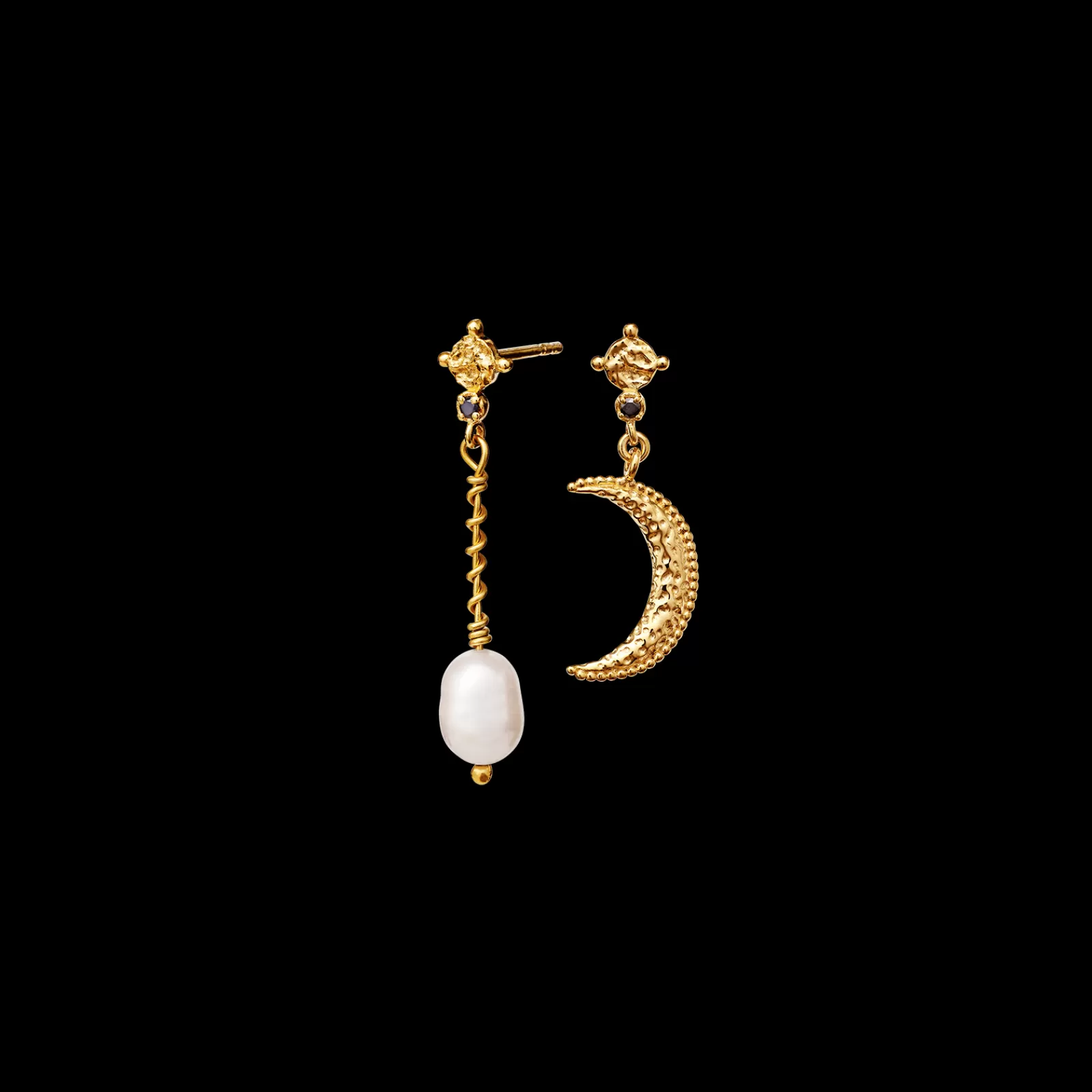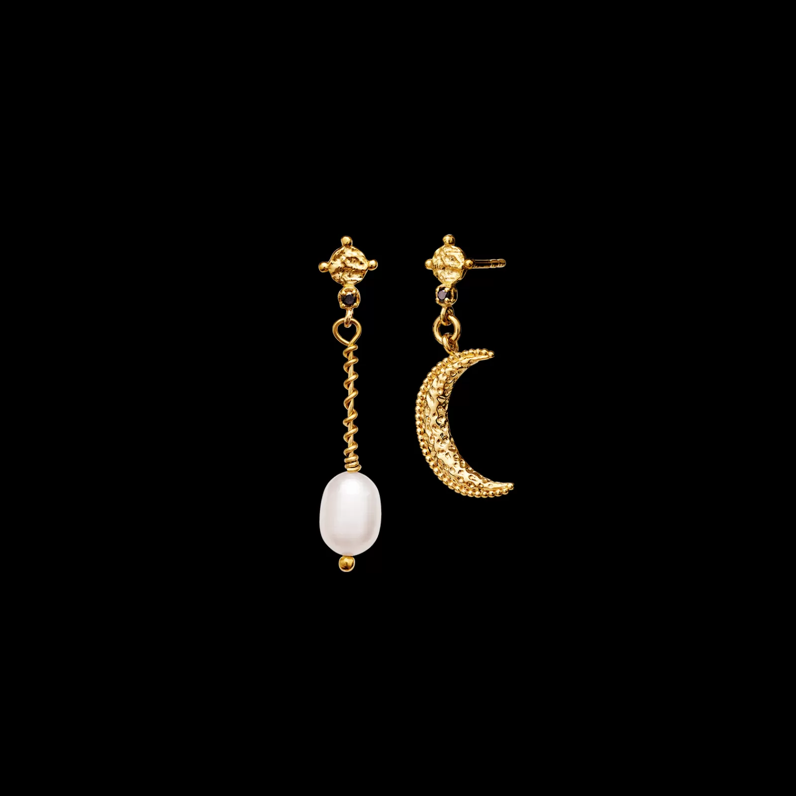 Nyla er et sæt bestående af to forskellige øreringe. Den ene med snoninger og en smuk ferskvandsperle, den anden en hammerslået måne. Til fælles har de hver især en lille sort diamant der sætter prikken over i’et.